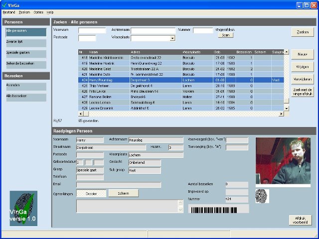 - Hoofdscherm Hieronder ziet u het hoofdscherm van VInGa. Aan de linkerkant van ziet u onder de hoofdgroep Personen, de 3 groepen 'Alle personen', 'zwarte lijst' en de 'speciale gasten'. Personen die op de zwarte lijst en de speciale gasten lijst zijn ingedeeld, worden door VInGa bij het vingerafdruklezen gesignaleerd. Bij personen van de zwarte lijst zal de portier actie moeten ondernemen. Voor personen van de speciale gasten-lijst zal vaak sprake zijn van gratis entree en moet de persoon achter de kassa actie ondernemen. Men kan zoeken naar personen en gevonden personen raadplegen, wijzigen of verwijderen. Bezoeken van geregistreerde personen zijn achter de optie bekende bezoeken te raadplegen. |
